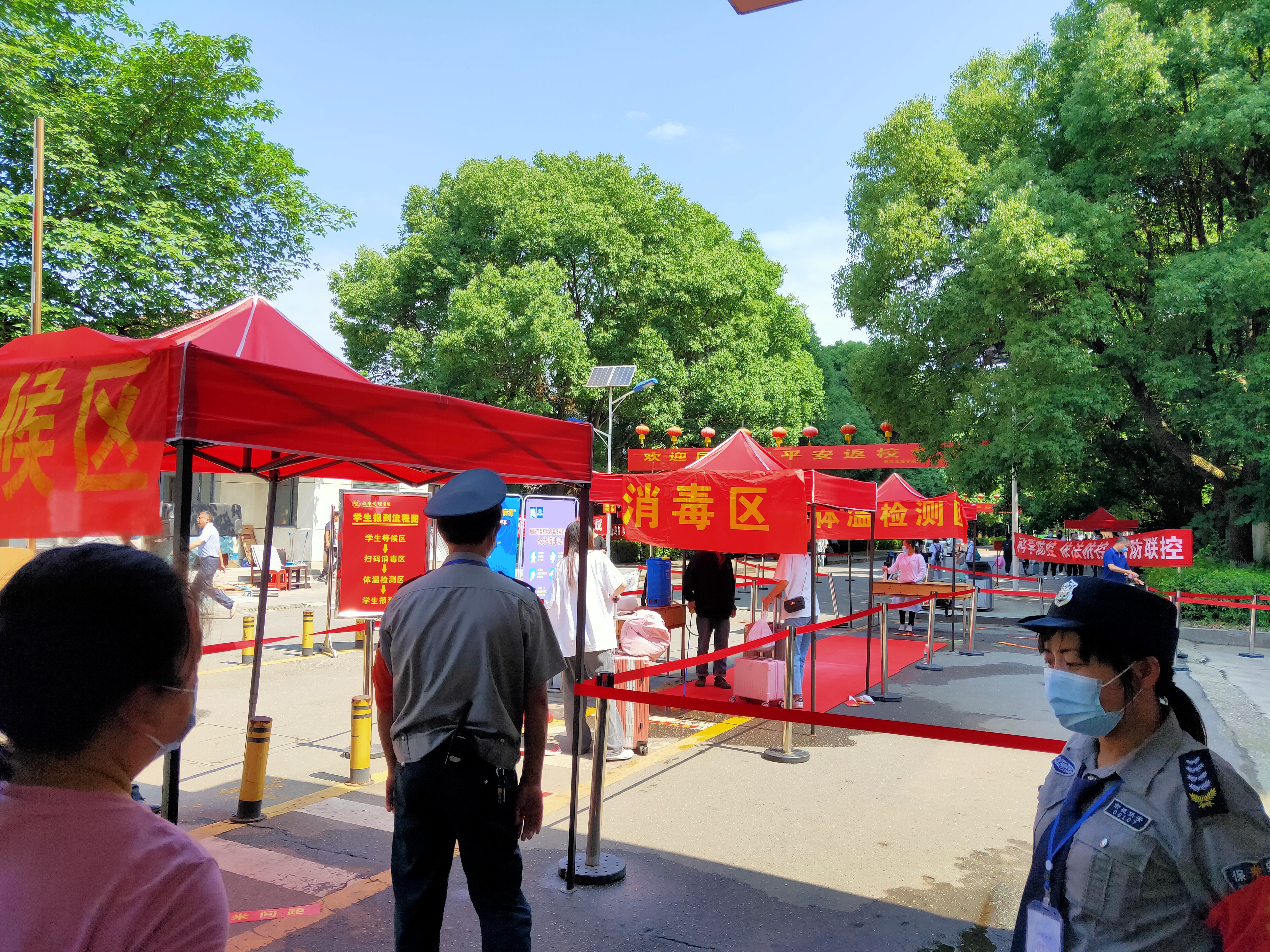 上午8时,学生们在老校区南门口,佩戴口罩,按照一米的安全距离,依次有序通过检疫通道,经过消毒、检查健康码、体温检测等验证合格之后,方能获准进入校园。