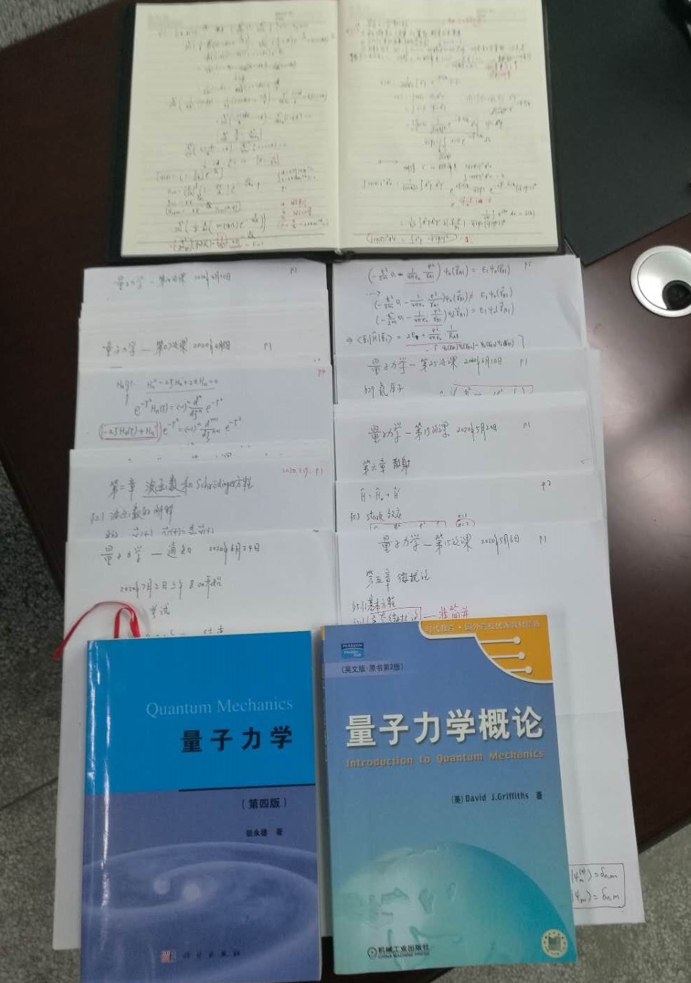 朱教授上网课时,总是先用支架架好手机,镜头对准办公桌上的A4纸,然后打开视频软件,一边讲解教学难点,一边用笔在白纸上一步一步推导物理公式。朱教授每次网课都坚持把白纸当“黑板”,一笔一划手书知识要点,一个学期下来,板书资料竟然积累了两大叠。