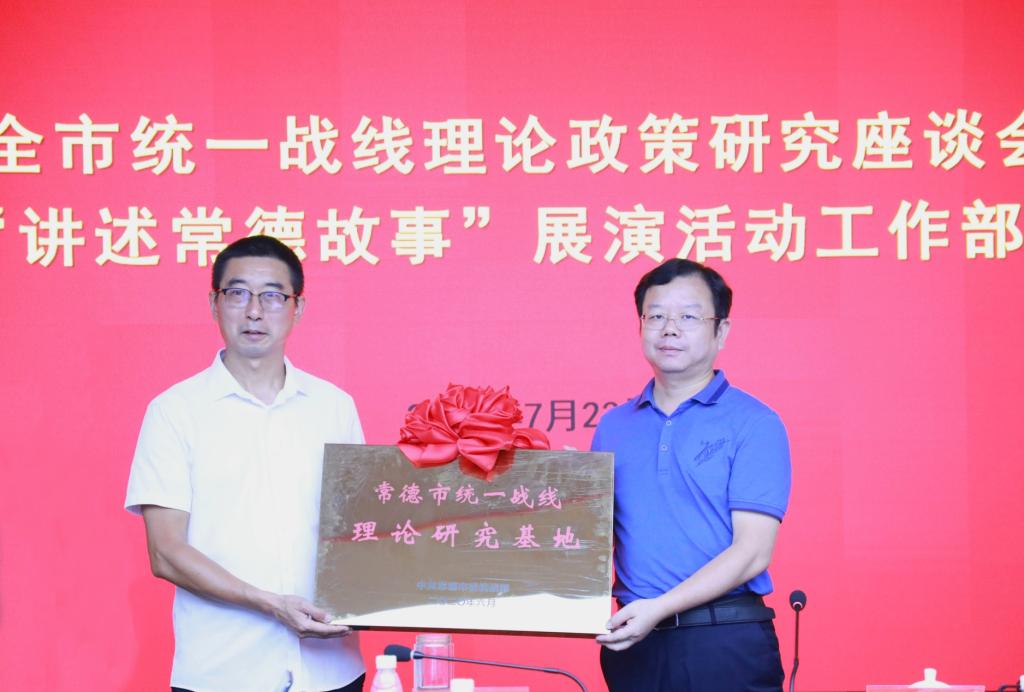 本网讯(记者 袁勇军)7月23日上午,在全市统一战线理论政策研究座谈暨“讲述常德故事”展演活动工作部署会上,市委统战部副部长余仁辉向我校马克思主义学院院长黄向阳授“常德市统一战线理论研究基地”牌匾,这标志着常德市首个统战理论研究基地正式落户湖南文理学院。会上还通报了2019年全市统战调研先进单位,湖南文理学院名列其中。市委统战部四级调研员魏云主持会议。