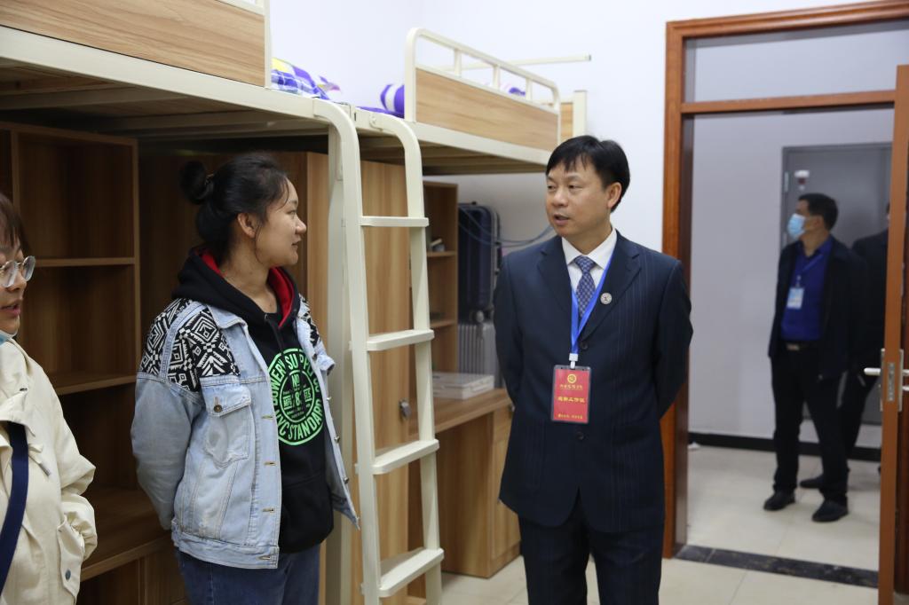 走访过程中,龙献忠等校领导在宿舍、食堂等地亲切与新生及家长交谈,仔细了解新生的报到和入住情况,询问大家一路是否顺利、住宿习不习惯、饭菜合不合口味等。