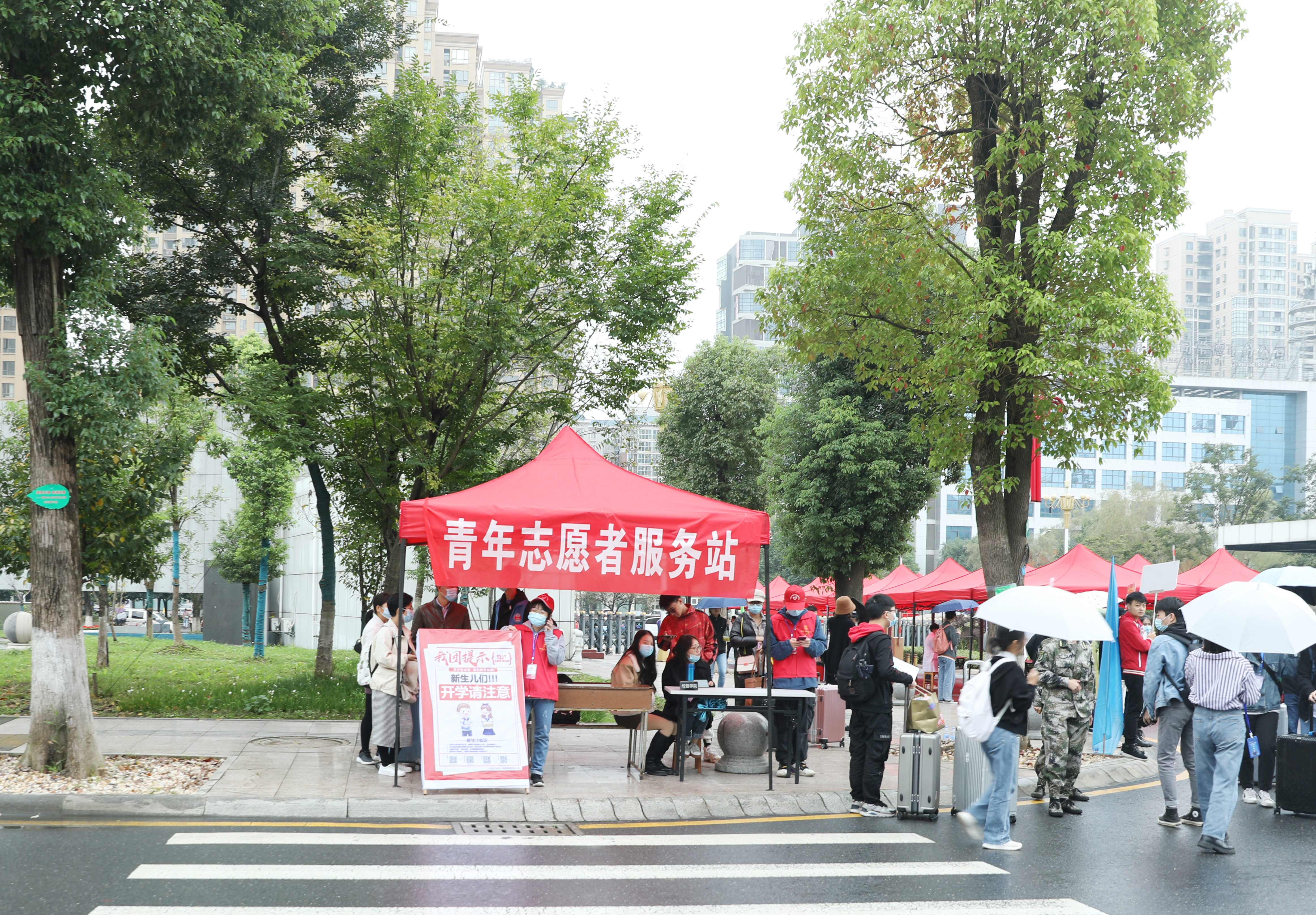 各迎新点设置了青年志愿者服务站引导新生报到