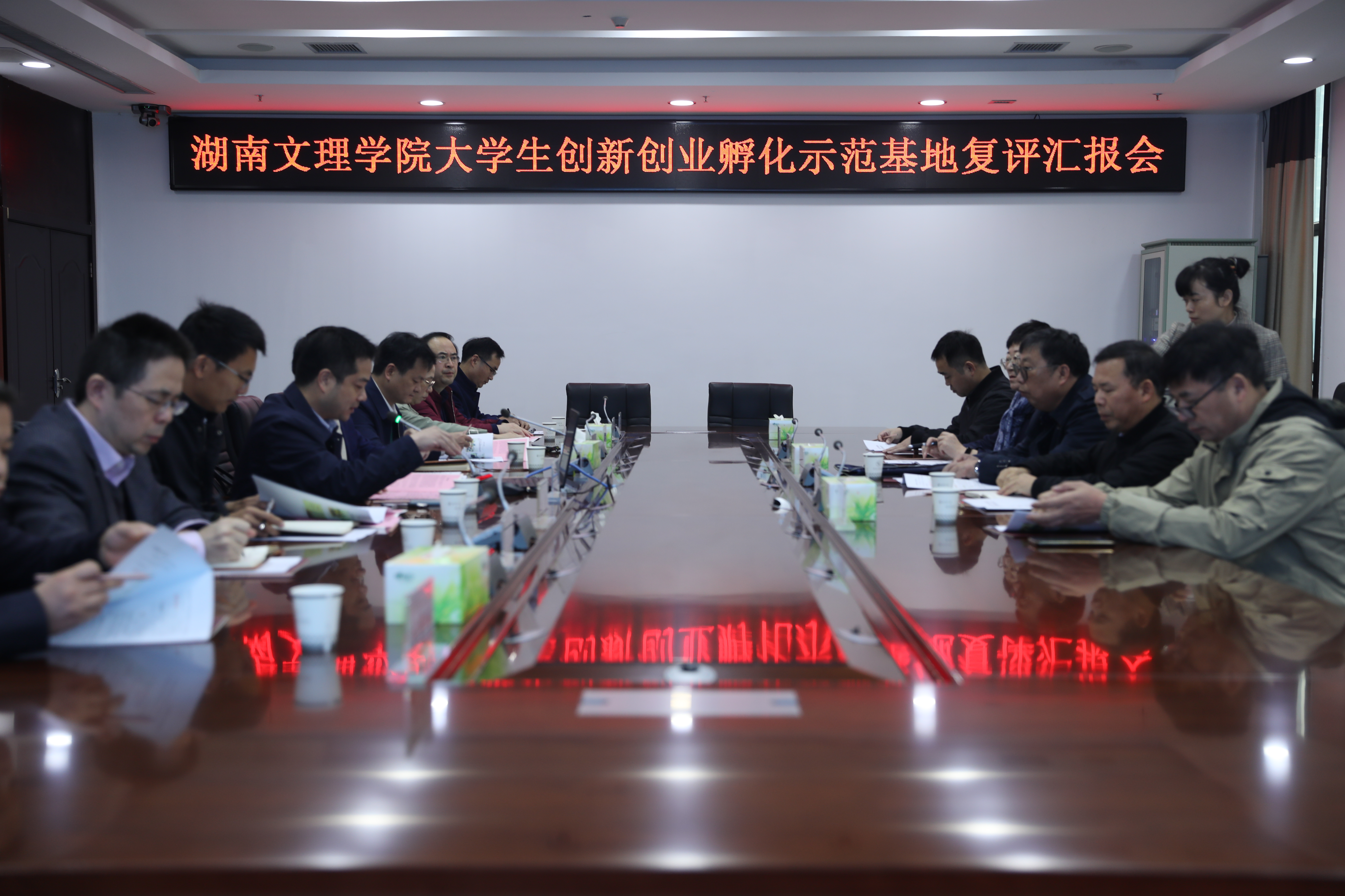 本网讯(通讯员 范鹏珍)10月19日上午,省教育厅专家组杨可以组长一行来我校复评大学生创新创业孵化示范基地工作。我校于2017年11月被湖南省教育厅确定为“湖南省高校大学生创新创业孵化示范基地”建设单位。党委委员、副校长郭国强,党委委员、组织部长戴军以及双创学院、团委、教务处、招就处、学工部和科研院负责人参加汇报会和反馈会。