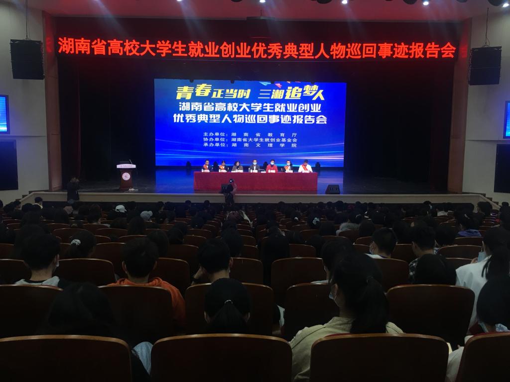 本网讯(记者 丁颖 王天慧 摄影 易姣)为进一步发挥就业创业先进典型示范引领作用,激发高校毕业生扎根基层、服务社会的干劲,10月29日下午,“青春正当时,三湘追梦人”湖南省高校大学生就业创业优秀典型人物巡回事迹报告会在我校艺术中心举行。本次活动由湖南省教育厅主办,湖南省大学生就创业基金会协办,报告团第一组长、教育厅学生处一级主任科员鲁光杰,我校校长助理齐恒出席报告会。招生就业处长杨云主持报告会。
