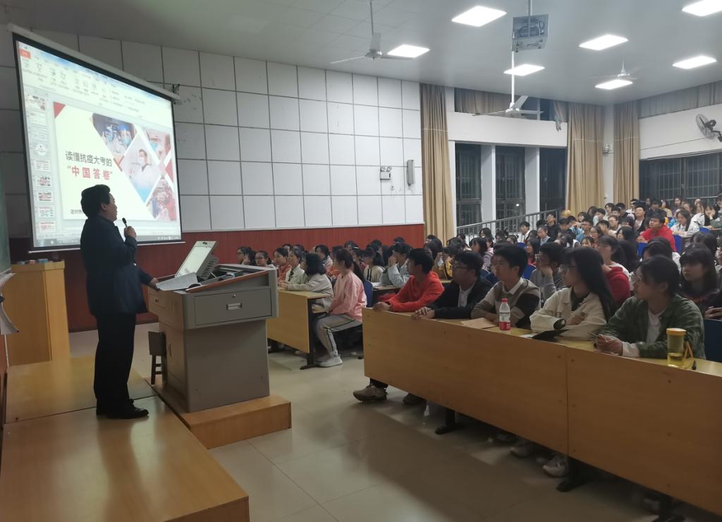 本网讯(通讯员 王日兴)11月10日晚上,学校纪委书记曾言教授以《读懂抗疫大考的“中国答卷”》为题,在T3-D102教室为师范学子上了一堂生动的形势与政策课,师范学院200余名师生聆听了报告。