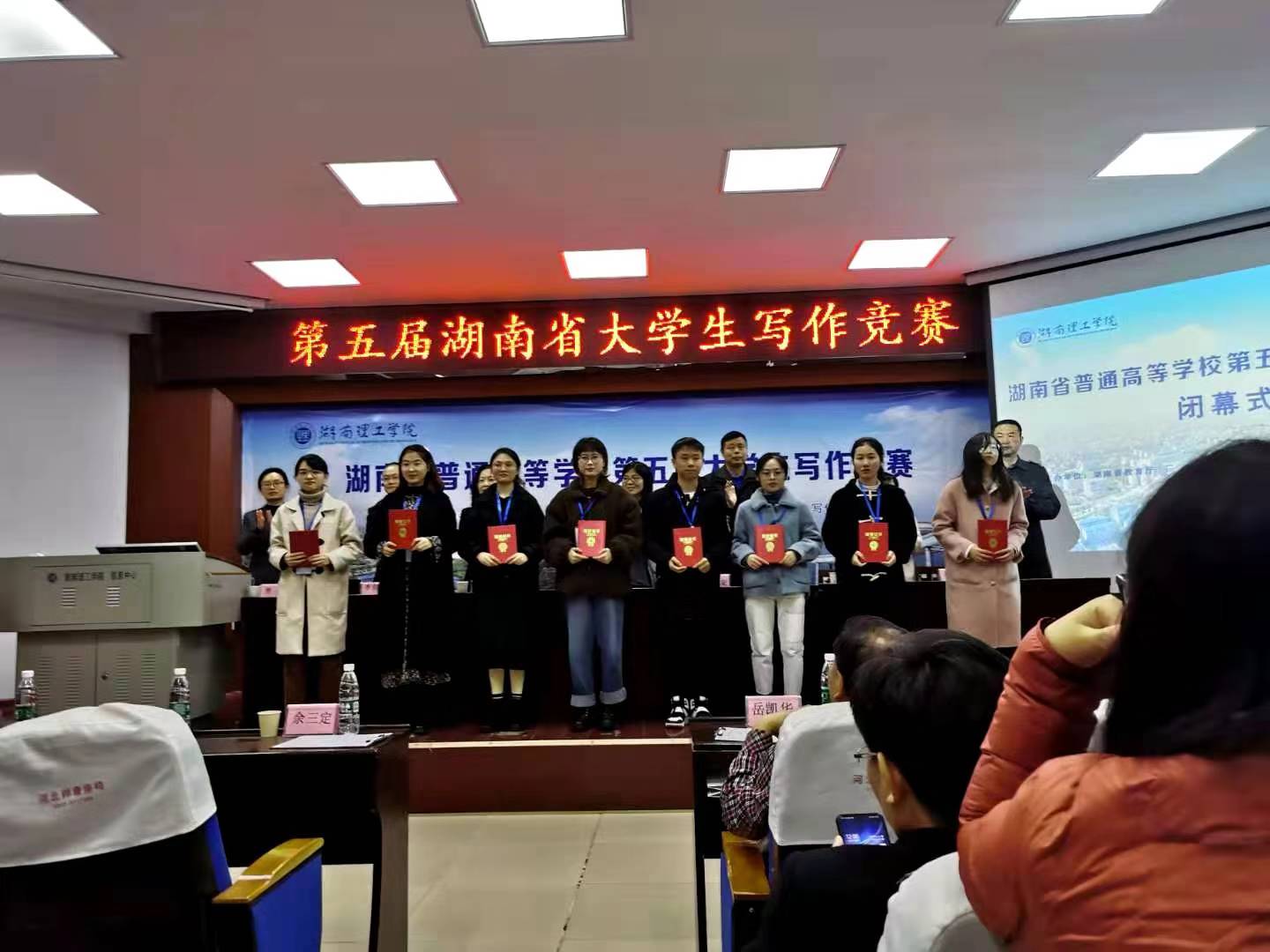 湖南省大学生写作竞赛是由省教育厅主办的中文专业唯一的学科竞赛,专业性强,基础性、理论性要求高。本次竞赛我校5名同学经过校内多次选拔和老师的精心指导脱颖而出,获得优异成绩,使我校在此项赛事中实现了一等奖的突破,总成绩也达到历史最好水平。