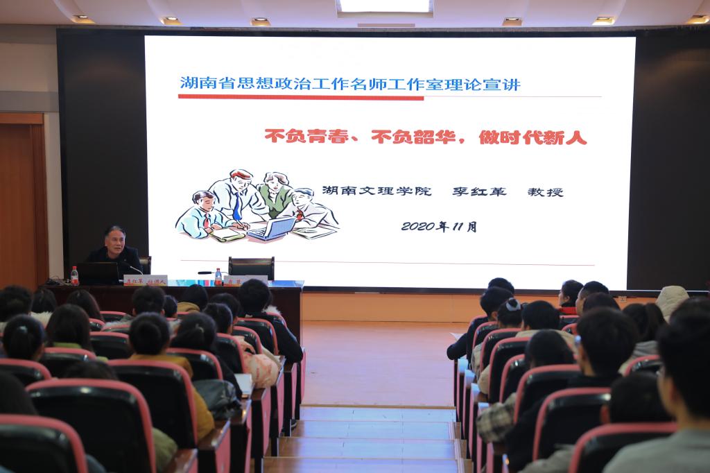 本网讯(通讯员 陈平涛 摄影 钟育平)12月2日,湖南省思想政治工作名师工作室理论宣讲课在图书馆二楼报告厅举行,党委委员、副校长李红革教授为师生授课。“青马工程”培训班学员、学生党员和学生干部代表共240余人参加学习。