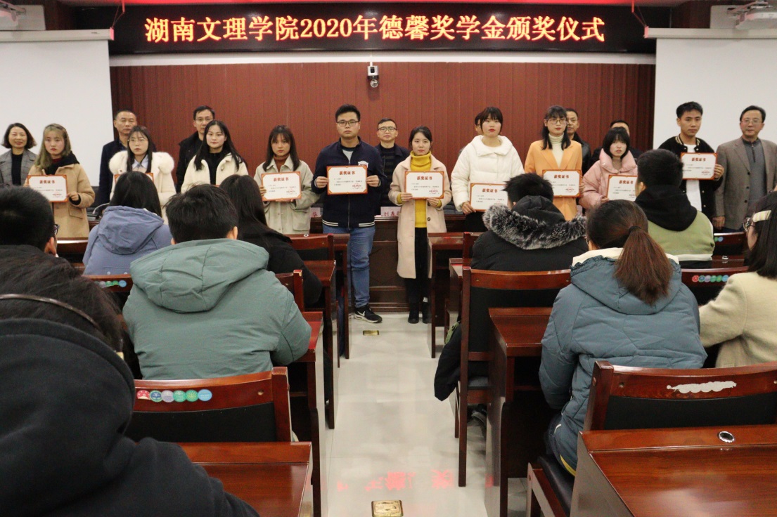 本网讯(通讯员 张一弛)12月25日,由我校地理专业90级校友杨军、张亚丽夫妇捐助设立的“德馨奖学金”,湖南中烟工业有限责任公司常德卷烟厂、常德烟草机械有限责任公司捐赠的学生助学金颁发仪式在逸夫楼B603举行。湖南德馨典当有限公司总经理田少华、常德烟草机械有限责任公司办公室副主任黄林、我校副校长刘春晖、各学院学生资助专干教师、获奖助学生共计120余人参加仪式。学工部副部长刘瑛主持仪式。