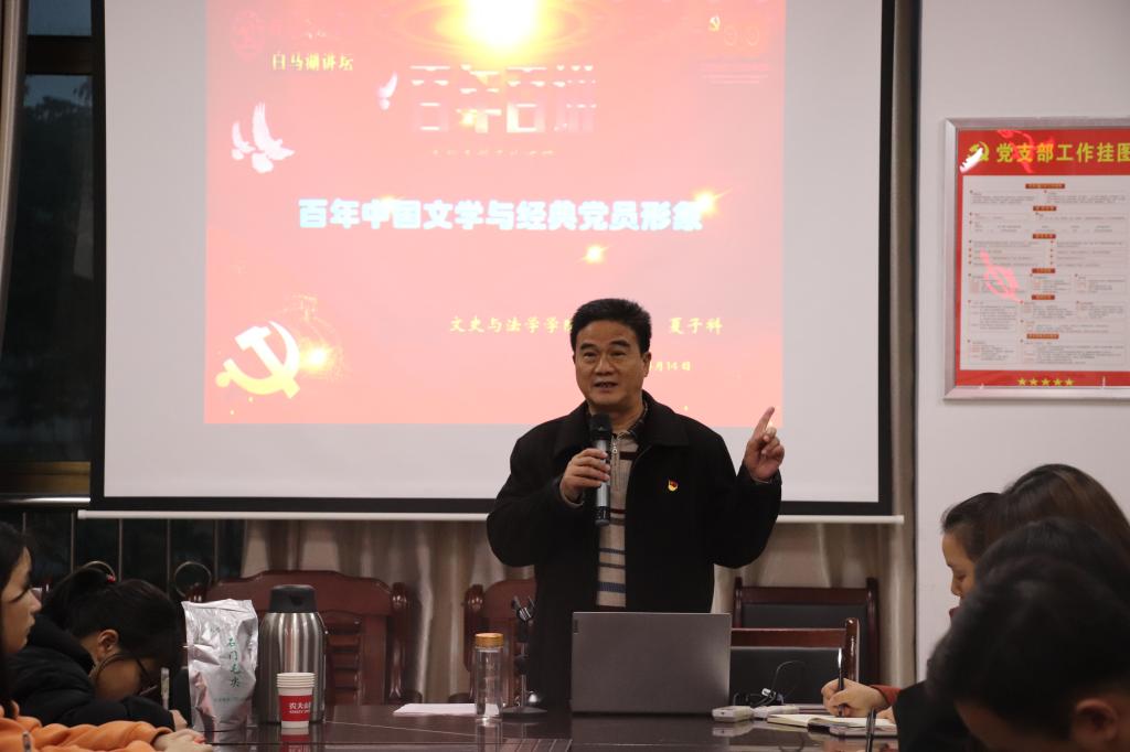 本网讯(通讯员 杨紫晴)4月14日晚,文史与法学学院党支部举行了“学党史,强信念,跟党走”主题教育活动。学院党总支书记夏子科以“百年中国文学与经典党员形象”为题,为学院60余名学生干部讲述了一堂精彩生动的主题党课。