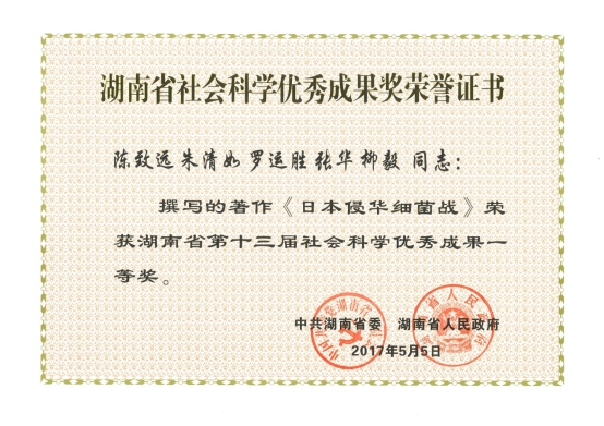 陈致远教授的“日本侵华细菌战”获得湖南省第十三届哲学社会科学优秀成果奖一等奖