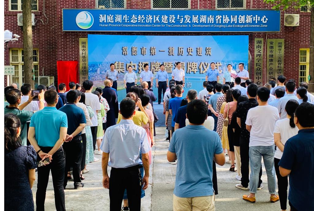 本网讯(校建处 供稿 摄影 田菊)为加强常德市历史建筑保护管理和利用,传承历史文化,保留历史记忆,6月16日上午,常德市第一批历史建筑集中授牌暨揭牌仪式在我校第一办公楼(红楼)前坪举行。常德市人民政府副市长尹正锡、市政府副秘书长彭家明,我校党委副书记、校长刘宇文,党委委员、副校长戴军出席活动。彭家明主持活动。