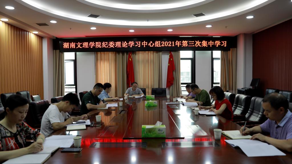 本网讯(通讯员 邓丽群)7月9日上午,学校纪委理论学习中心组2021年第三次集中学习在逸夫楼A704举行。党委委员、纪委书记郭文超主持学习,校纪委委员、纪委办、监察专员办工作人员参加学习。会上学习了《习近平总书记在庆祝中国共产党成立100周年大会上的讲话》《湖南出台加强“一把手”监督“十必严”措施》《中国共产党组织处理规定(试行)》等,全体纪委委员作了学习交流发言。