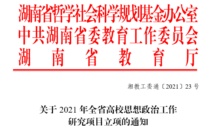 本网讯(记者 袁勇军)近日,湖南省哲学社会科学规划基金办公室、省委教育工委、省教育厅发布《关于2021年全省高校思想政治工作研究项目立项的通知》,我校罗碧琼老师的项目《“三全育人”背景下乡村教师培养“生命”模式研究》、赵柳老师的项目《地方高校创新创业与思政教育融合路径研究》入选高校思想政治教育项目,黄向阳老师的项目《大学携手小学共建思政师资和课程资源的实践探索》入选思想政治理论课教研专项项目,邓俊老师的项目《乡村振兴战略下家国情怀培育引导大学生基层就业的研究》入选辅导员骨干专项项目。