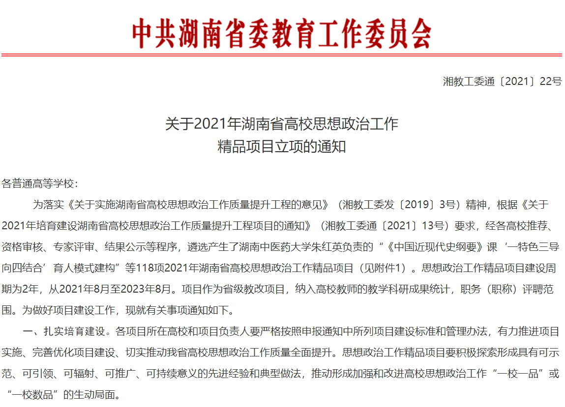 8月19日,省委教育工委、省教育厅发布《关于2021年湖南省高校思想政治工作精品项目立项的通知》,我校朱晓红老师的项目《微传播时代“经典诵读进高校”文化育人模式创新与实践》入选文化育人精品项目,马晗初老师的项目《“抓两头促中间”党建统领一体化组织育人模式创新与实践》入选组织育人精品项目。