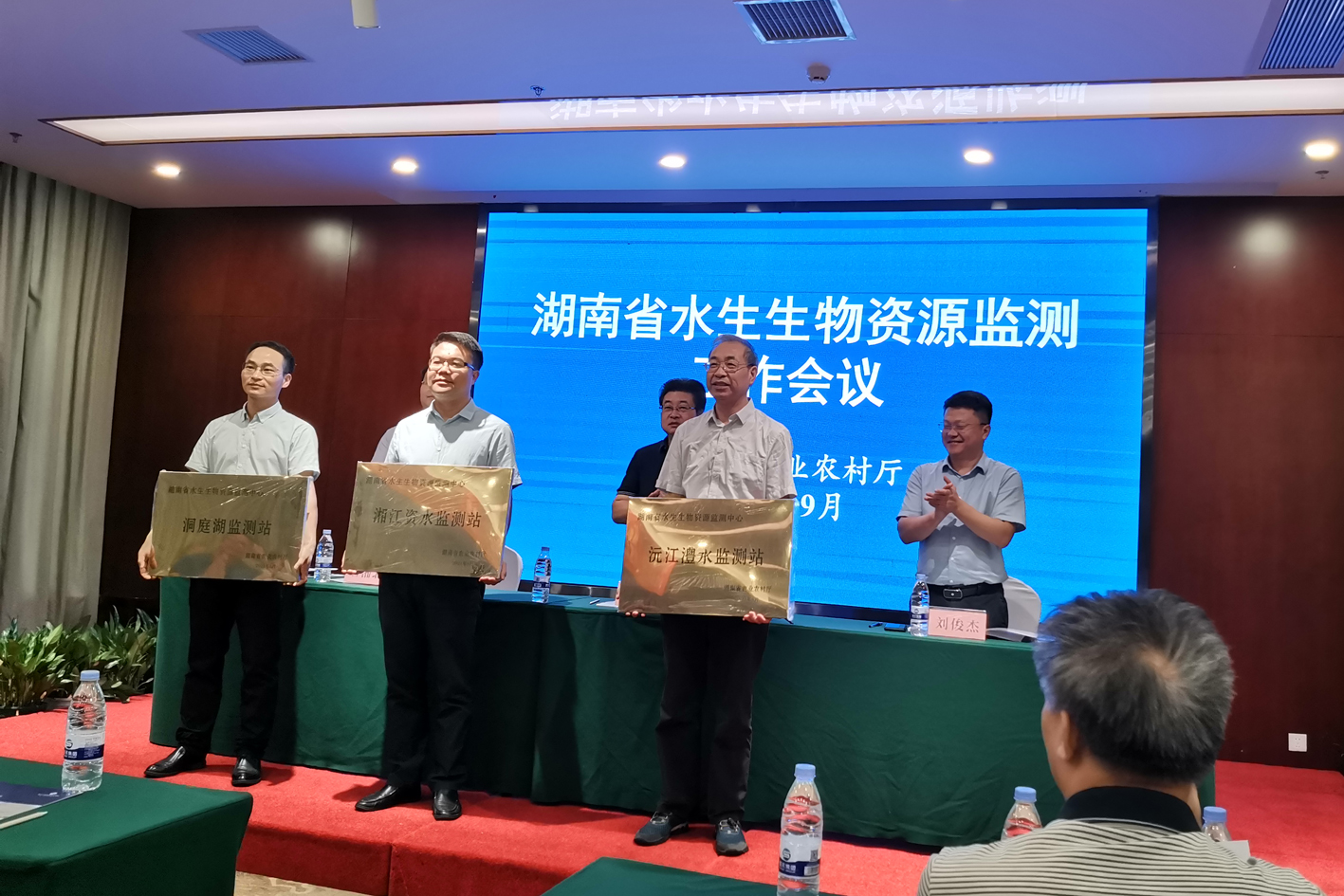 本网讯(通讯员 罗丛强)9月16日,湖南省水生生物资源监测工作会议在长沙召开,会议全面部署湖南“一江一湖四水”水域全面禁鱼后水生生物资源监测和生物完整性评估工作。湖南省农业农村厅副厅长、湖南省畜牧水产事务中心书记、主任徐旭阳等领导为湖南省水生生物资源监测中心、洞庭湖监测站、湘江资水监测站、沅江澧水监测站授牌。我校生环学院院长杨品红作为沅江澧水监测站站长接授监测站匾牌。