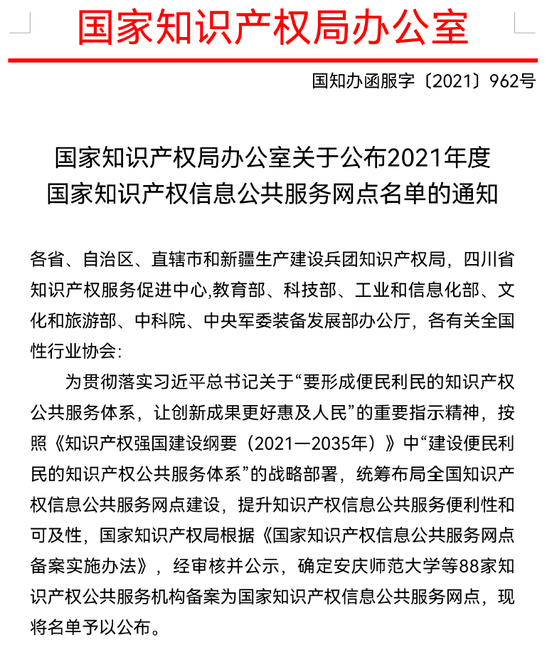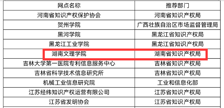 本网讯(通讯员 李云安)10月25日,国家知识产权局公布了2021年国家知识产权信息公共服务网点备案名单,全国有88家机构获批, 湖南文理学院成为今年湖南省唯一的一所入选高校。