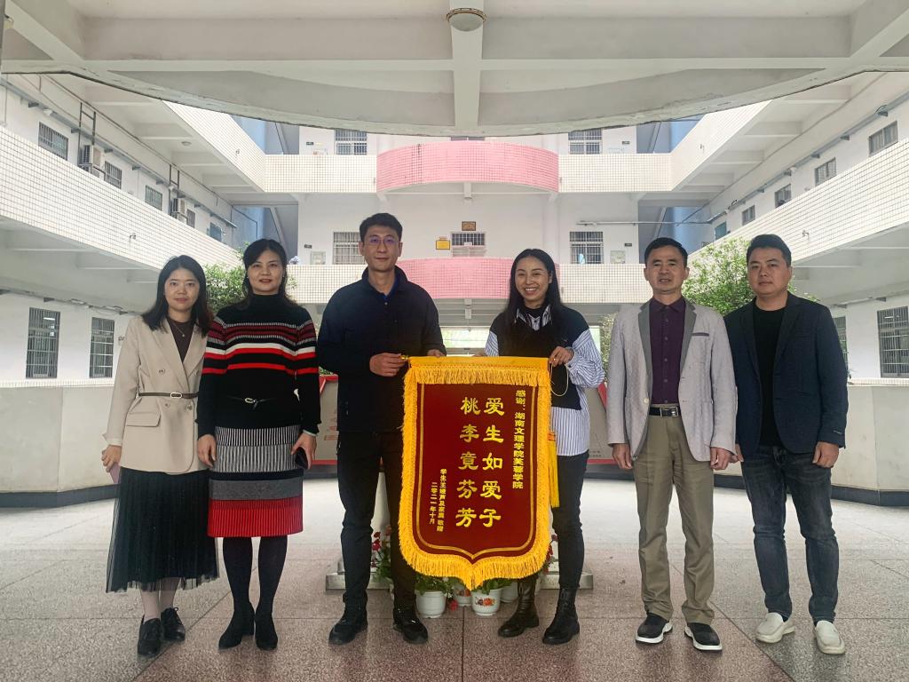 本网讯(通讯员 刘彦君)11月1日上午,我校芙蓉学院图书馆一楼大厅出现了感人的一幕:文学与社会科学系汉语言文学专业2021级新生王娅芦的母亲将写有“爱生如爱子,桃李竞芬芳”的锦旗送到了学院党委副书记、院长乔臣的手中,并感激地说:“你们是孩子的救命恩人!我们全家都感恩湖南文理学院芙蓉学院……”