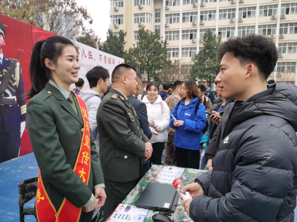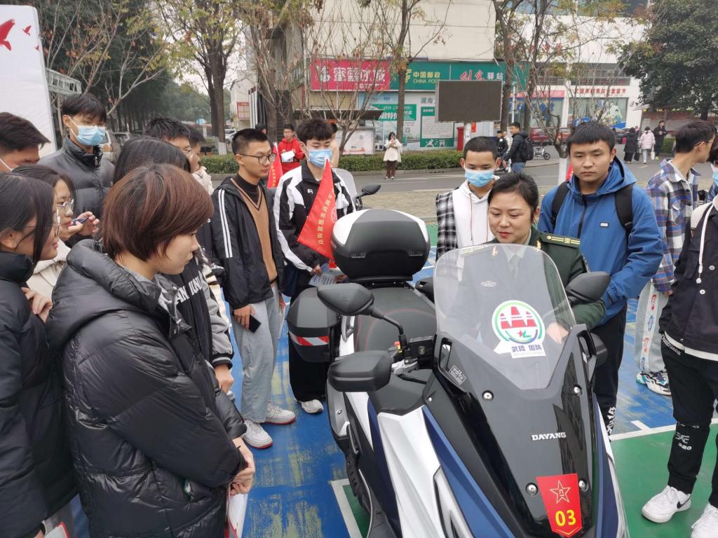 在学校第四食堂门口,区人武部征兵工作人员通过设立咨询台、张贴宣传标语、发放《征兵政策宣传手册》等形式向大学生详细介绍了征兵流程、条件、政策等相关事宜。武陵女子民兵志愿宣讲队现场展示轻骑摩托车,现场近千名大学生前来参观咨询。