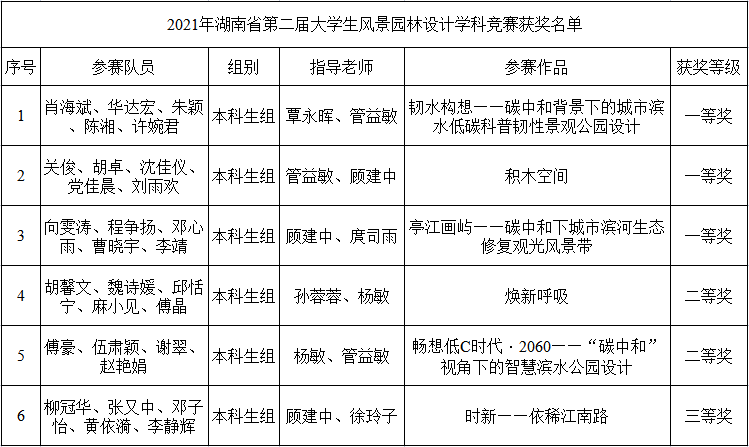 本网讯(土建学院 供稿)近日,由湖南省教育厅主办,中南林业科技大学承办的湖南省第二届大学生风景园林学科竞赛获奖结果揭晓。我校土建学子在覃永晖、顾建中、管益敏、孙蓉蓉、庹司雨、杨敏、徐玲子等老师的指导下,荣获一等奖3项、二等奖2项、三等奖1项,总成绩在全省高校本科组中排名第一,并获得“优秀组织奖”,实现了我校在该项省级学科竞赛中历史最好成绩。