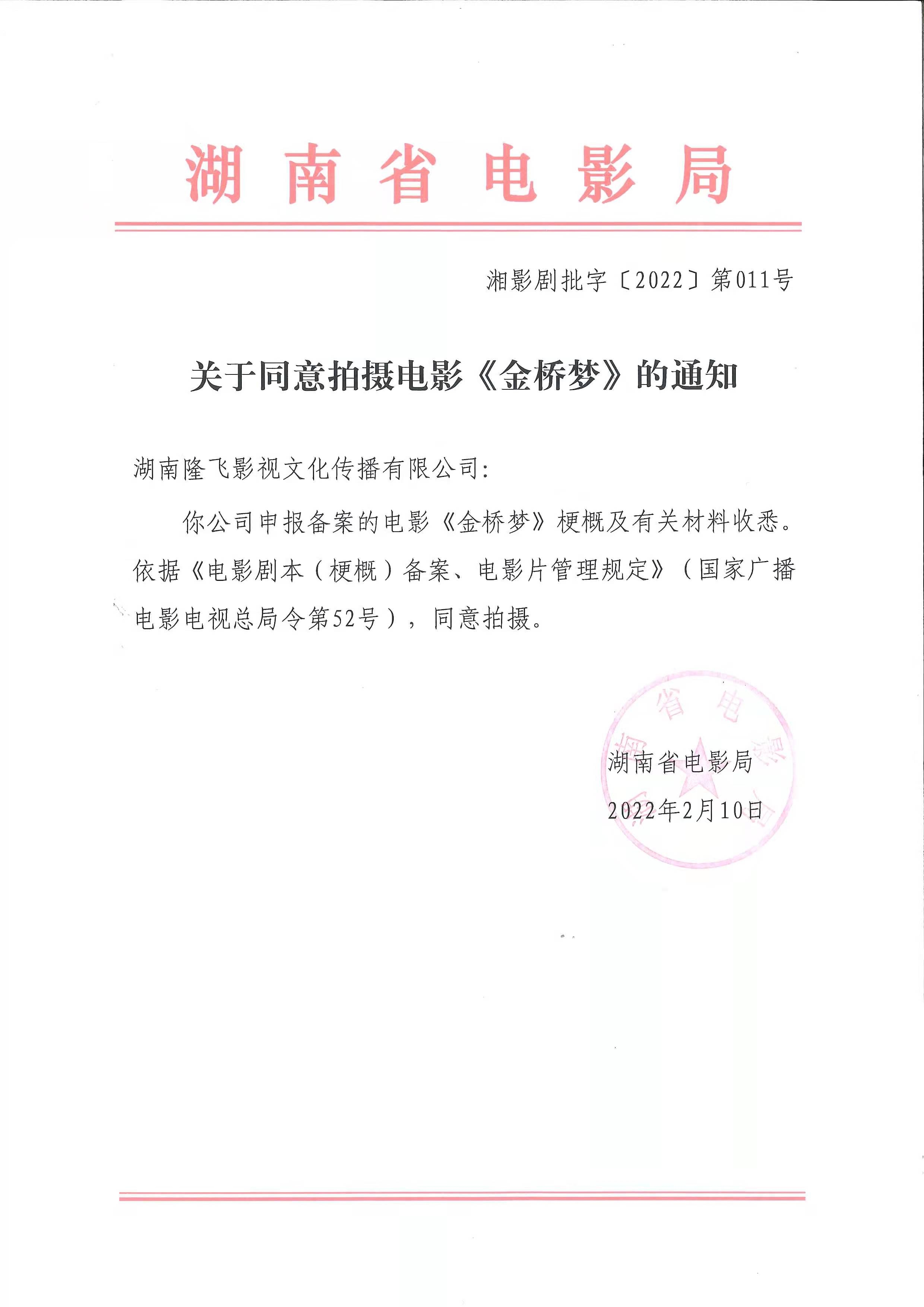 本网讯(通讯员 李云安)日前,由我校文法学院周星林教授、常德知名女作家邓爱珍创作,湖南隆飞影视文化传播有限公司与湖南焰渠影视公司联合申报的院线电影剧本《金桥梦》先后通过湖南省电影局初审和国家电影局终审,获准正式立项。