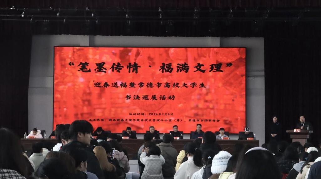 本网讯(文字 胡秋菊 叶君 图片 高小星 李佳琦)1月6日下午,“笔墨传情·福满文理”常德市高校大学生书法巡展暨喜迎新年活动在我校东校区体育馆举行。本次活动由我校东校区管理办公室(筹)与常德市书法家协会联合主办,常德市青年书法家协会、常德市青年文艺交流协会协办。