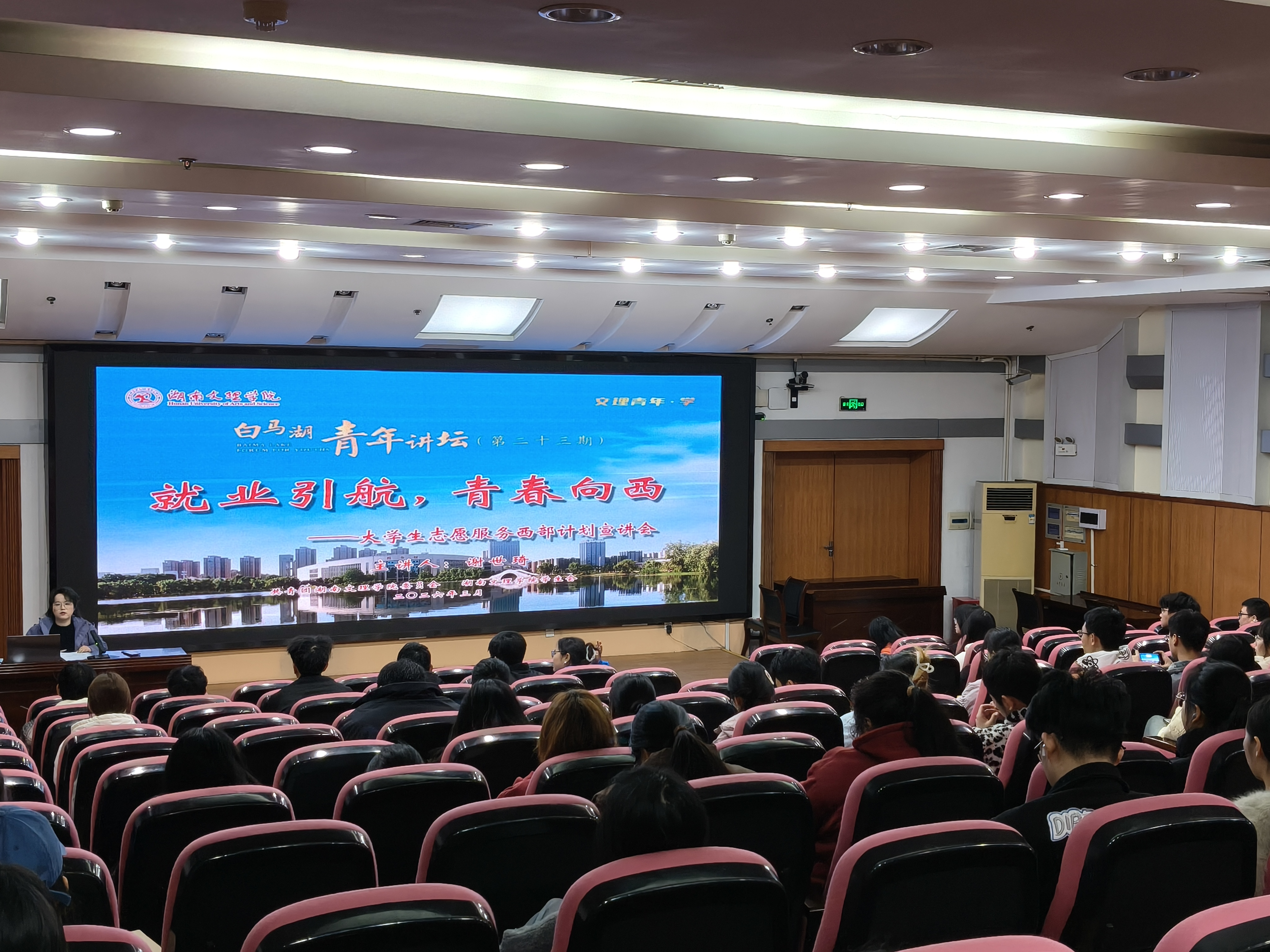 本网讯(文字 谢世琦 图片 丁婉倪)3月20日,我校第二十三期白马湖青年讲坛在图书馆报告厅举行。本期讲坛以“就业引航·青春向西”为主题,聚焦大学生志愿服务西部计划,面向应届毕业生系统解读相关政策,引导青年学子扎根基层、服务西部,以青春之力奔赴西部建设热土。