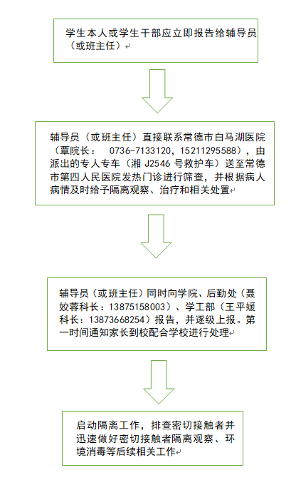 学生在返校期间或返校后一旦发现发烧、干咳、乏力等症状者,按以下步骤处理: