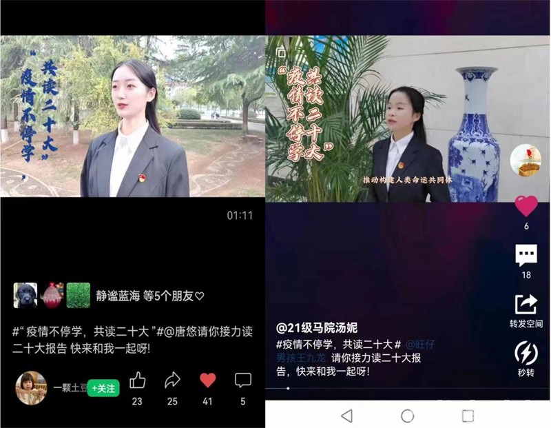 在学习活动中,马克思主义学院教师鼓励思想政治教育专业学生自己录制诵读党的二十大报告原文的视频,并将录制好的诵读视频上传至社交平台,同时@至少一位同学进行接龙,争做学习、宣传、贯彻党的二十大精神的领航雁、排头兵,及时准确地将所学所思融入到全面建设社会主义现代化国家的火热实践中。