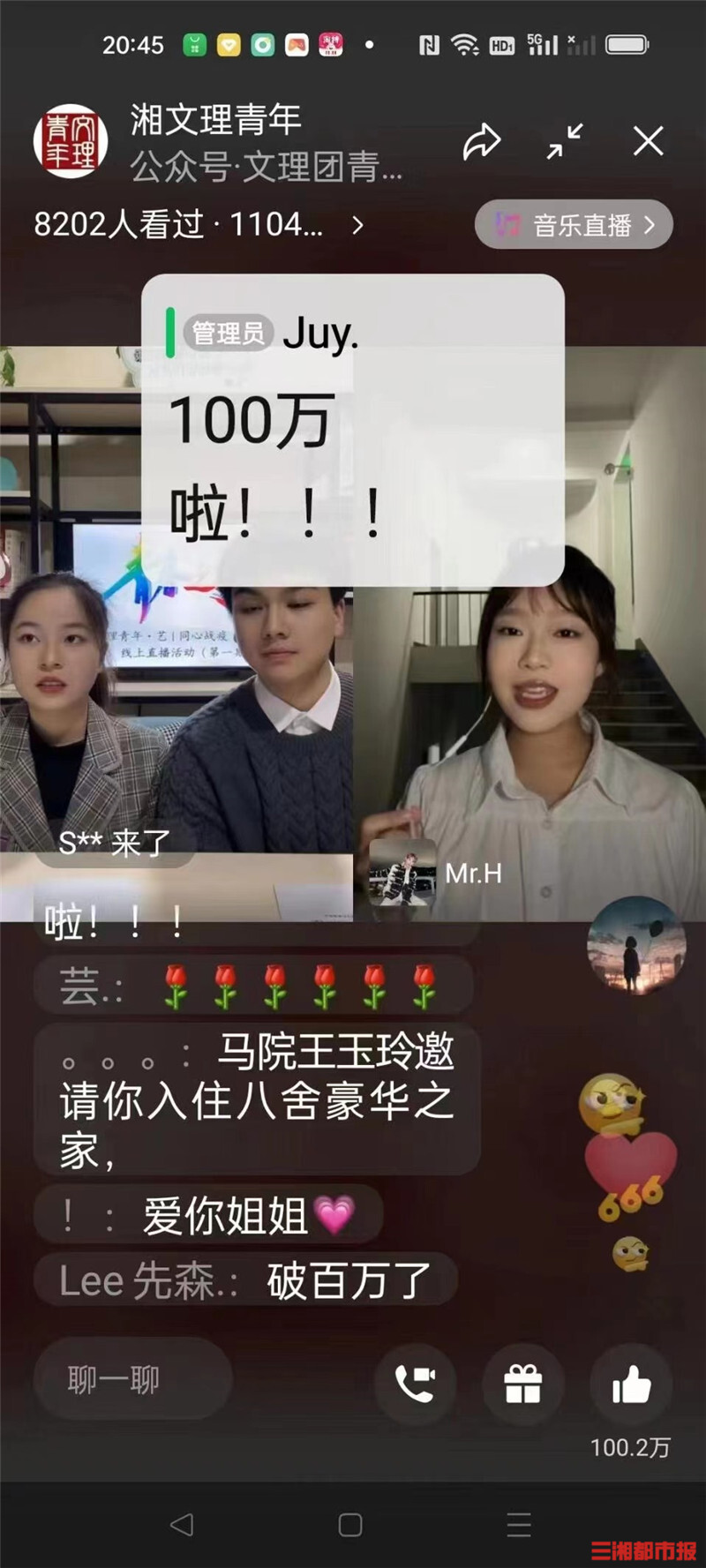 近日,湖南文理学院团委举办了第一期文理青年“同心战疫青春歌会”线上直播活动。演出现场没有热烈的欢呼声,大家却用一条条弹幕文字传递着抗疫必胜的力量和勇气,打造了一场相约云端的“演唱会”。全程近万人在线观看并参与互动,获得点赞次数高达114.9万。