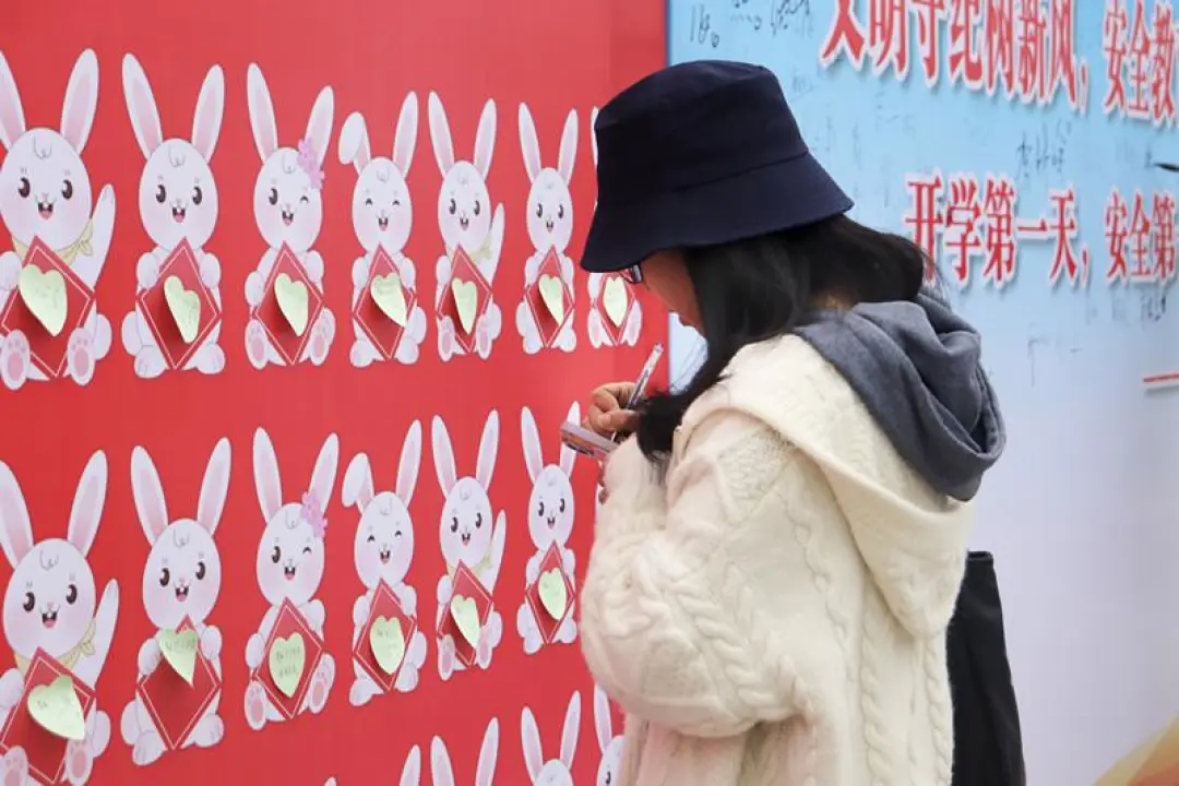 返校的同学们惊喜地看到,两只福兔扭动着呆萌的身体与大家打招呼,或张开双臂拥抱阔别多日的同学。同学们还在福兔的指引下,来到学校精心制作的许愿墙前,写下新学期愿望。