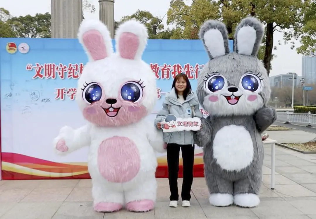 日前,湖南省内各高校陆续迎来新学期开学。在湖南文理学院开学日,校门口两只可爱的“福兔”吸引了不少学生围观。