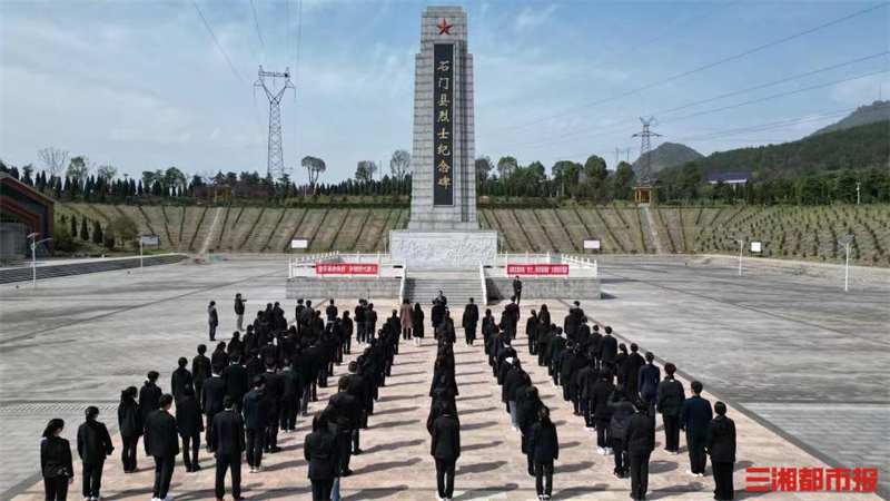 三湘都市报4月3日讯(通讯员 张一驰 汤妮 全媒体记者 刘镇东)烈士陵园内庄严肃穆,学校国旗仪仗队向巍然屹立的烈士纪念碑敬献花篮,全体师生静静地肃立,为革命英烈默哀,向长眠于地下的革命先烈深深鞠躬……近日,湖南文理学院200余名青年师生,到常德市石门县烈士陵园开展“烈士,我与您同龄!”清明祭革命英烈主题团日活动。