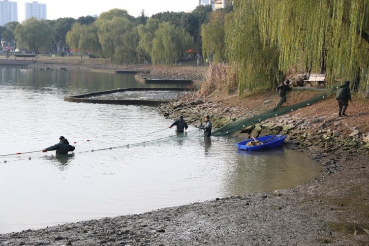 Staff members catch fish with a net at the Hunan University of Arts and Science in Changde, central China's Hunan Province, Dec. 25, 2023. (Photo by Cai Wenlong/Xinhua)