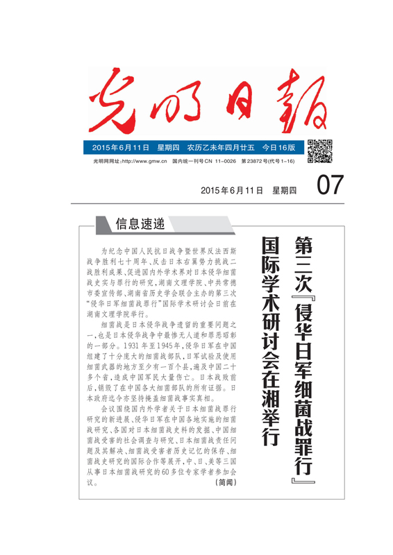 第三次“侵华日军细菌战罪行”国际学术研讨会在湘举行 光明日报 6月11日