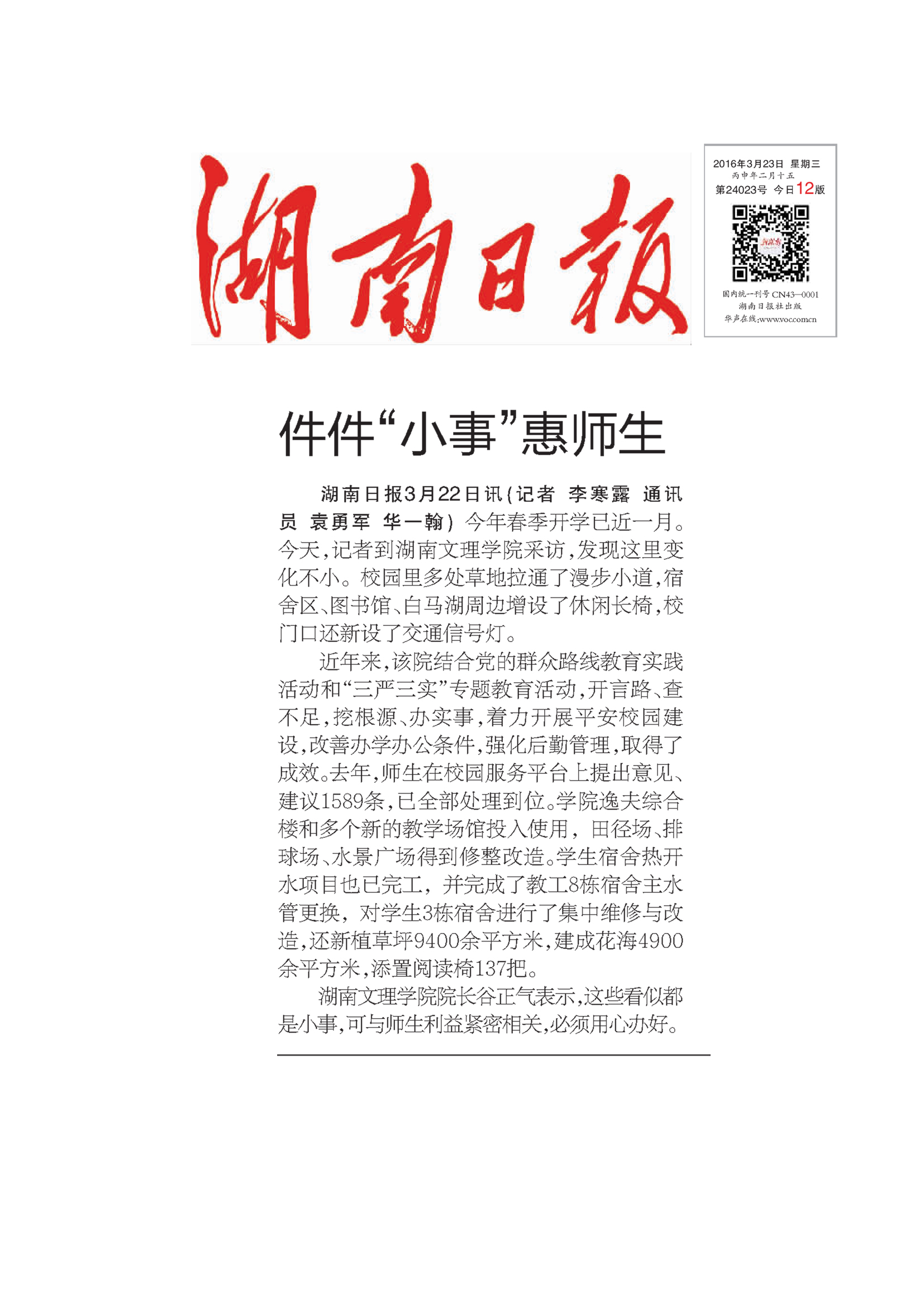 件件“小事”惠师生 湖南日报 3月23日