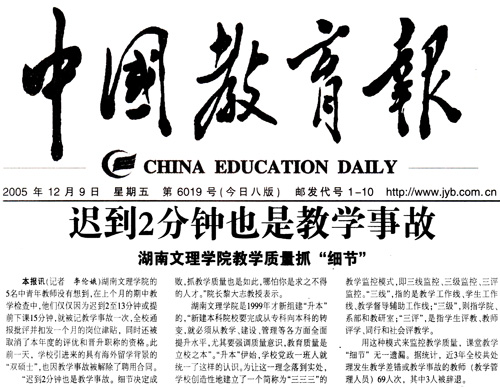 《中国教育报》2005年12月9日:迟到2分钟也是教学事故--湖南文理学院教学质量抓“细节”