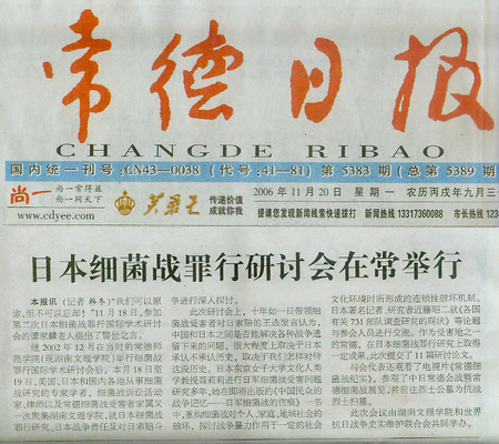 《常德日报》2006年11月20日头版:日本细菌罪行研讨会在常举行