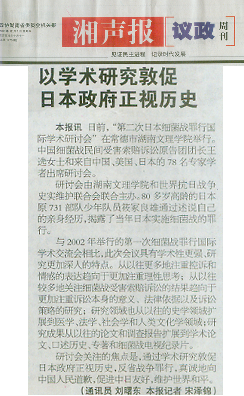 《湘声报》议政周刊2006年12月1日头版:学术研究敦促日本政府正视历史