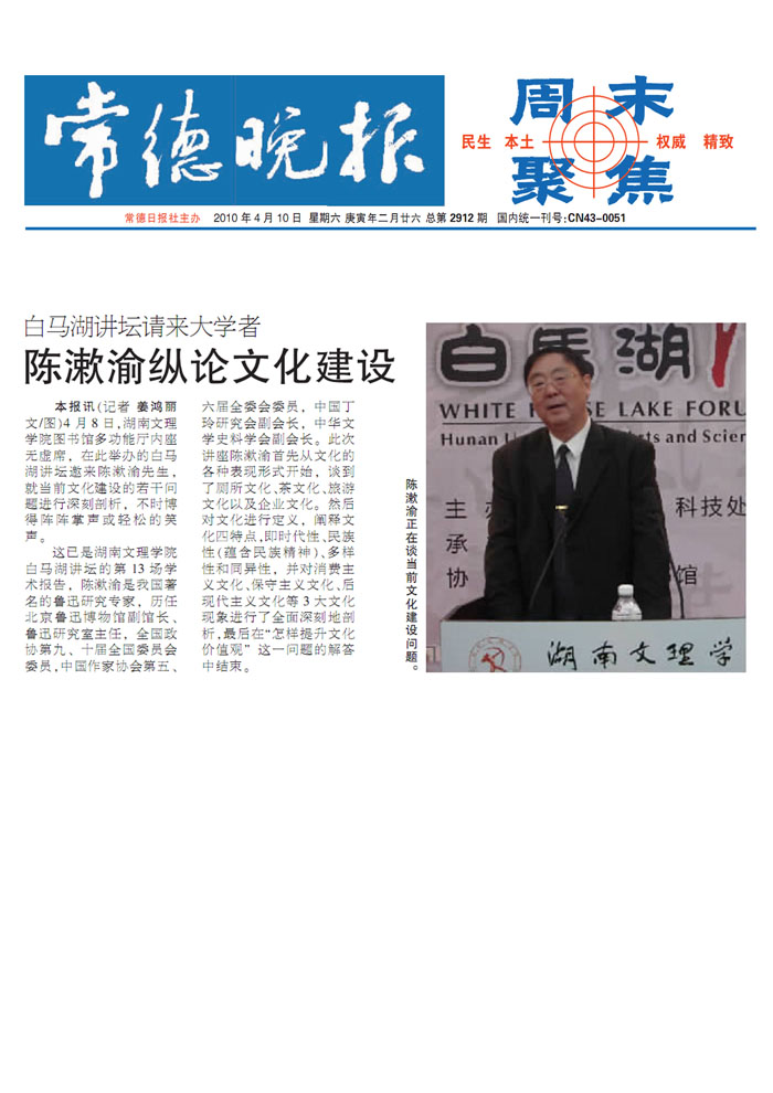 《常德晚报》白马湖讲坛请来大学者 陈漱渝纵论文化建设