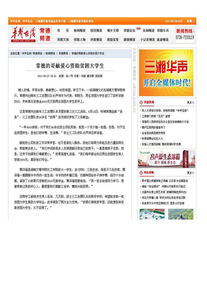 《华声在线》常德的哥献爱心资助贫困大学生