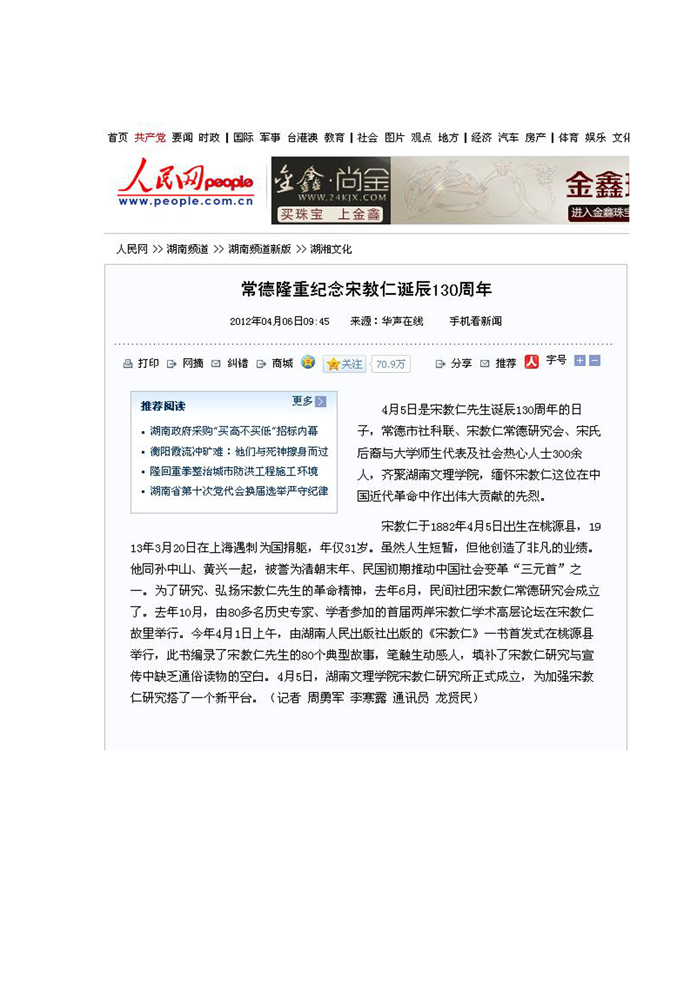 《人民网》:常德隆重纪念宋教仁诞辰130周年
