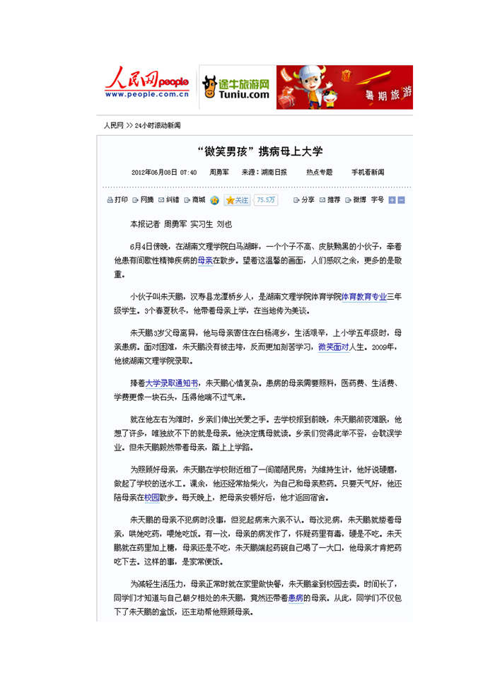 《人民网》:“微笑男孩”携病母上大学