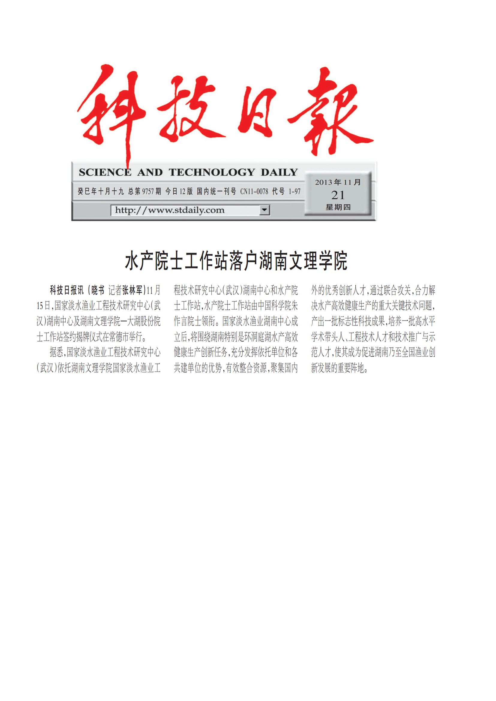 水产院士工作站落户湖南文理学院 科技日报