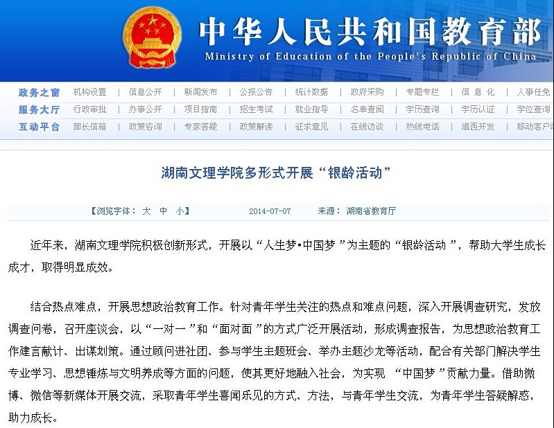 教育部官网首页报道我校多形式开展“银龄活动”