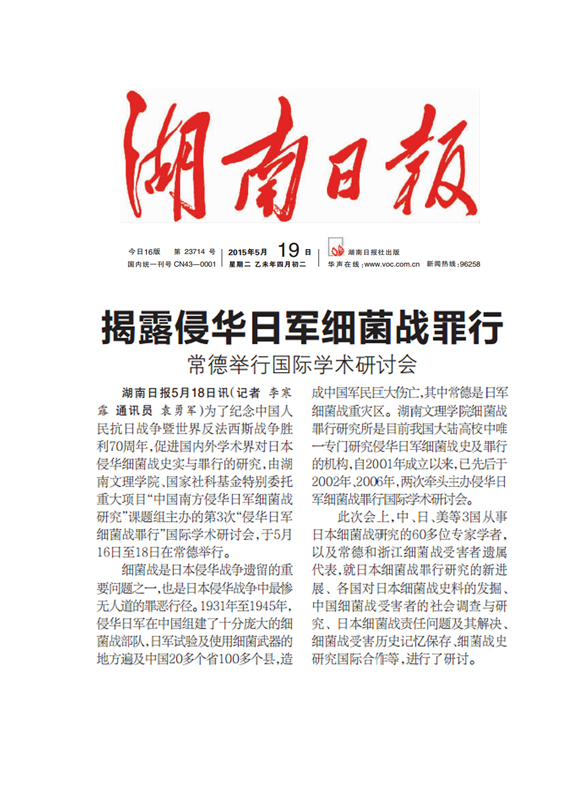 揭露侵华日军细菌战罪行(湖南日报)5月19日