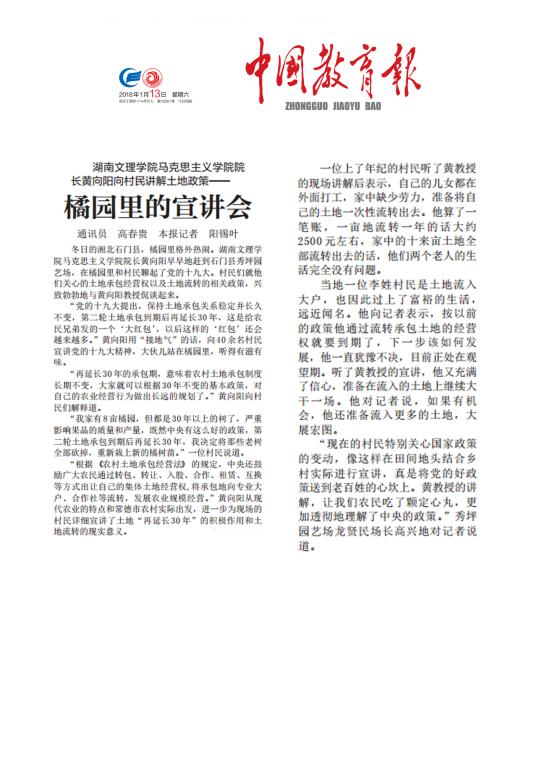 中国教育报:湖南文理学院马克思主义学院院长黄向阳向村民讲解土地政策——橘园里的宣讲会
