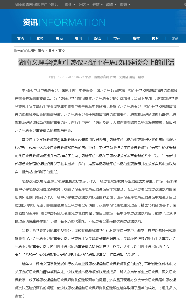 湖南教育网:湖南文理学院师生热议习近平在思政课座谈会上的讲话