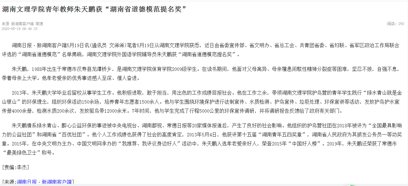 新湖南:湖南文理学院青年教师朱天鹏获“湖南省道德模范提名奖”