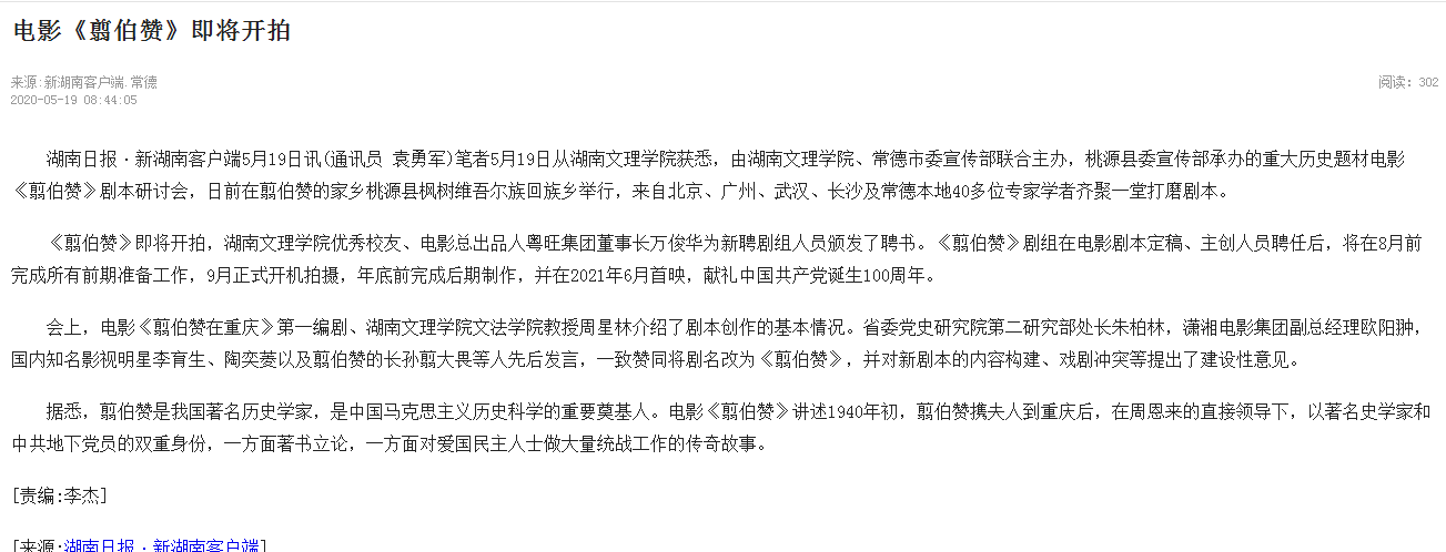 新湖南:电影《翦伯赞》即将开拍