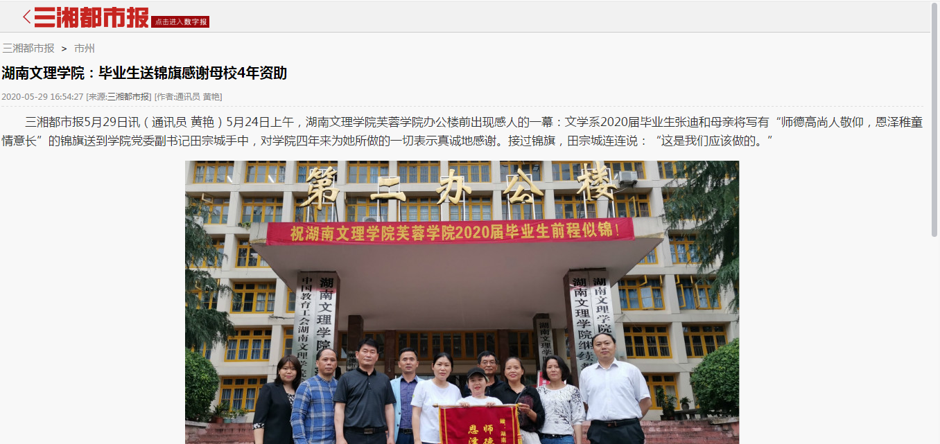 三湘都市报:毕业生送锦旗感谢母校4年资助