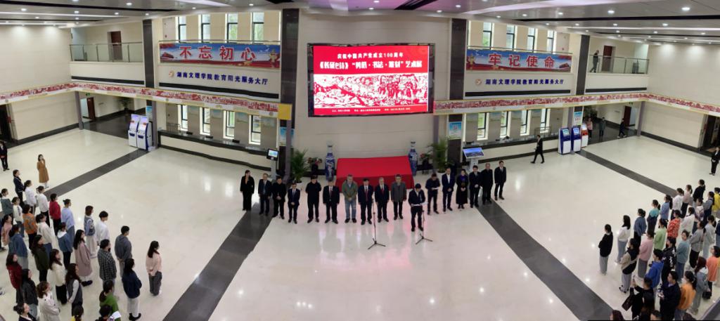4 月 22 日上午,庆祝中国共产党成立 100 周年《长征史诗》" 剪纸 · 书法 · 篆刻 " 艺术展在湖南文理学院逸夫楼一楼大厅正式开幕,吸引了数百名师生到现场驻足欣赏。